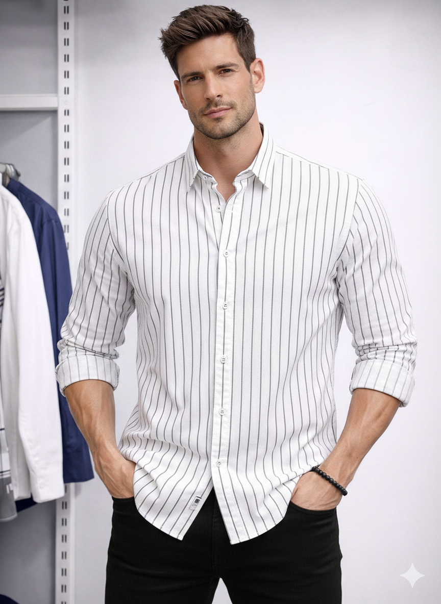 Erkek Beyaz Çizgili Slim Fit Gömlek – Uzun Kollu Pamuklu Spor Gömlek