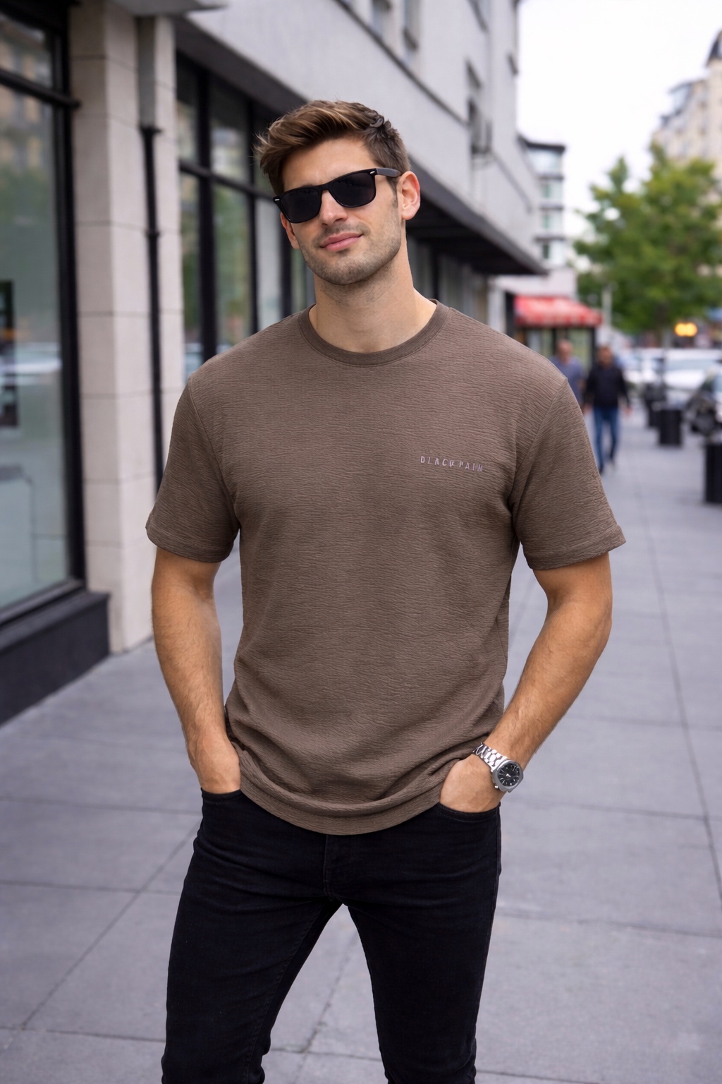 Kahverengi Dokulu Erkek Basic Tişört – Slim Fit Yazlık T-Shirt