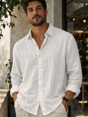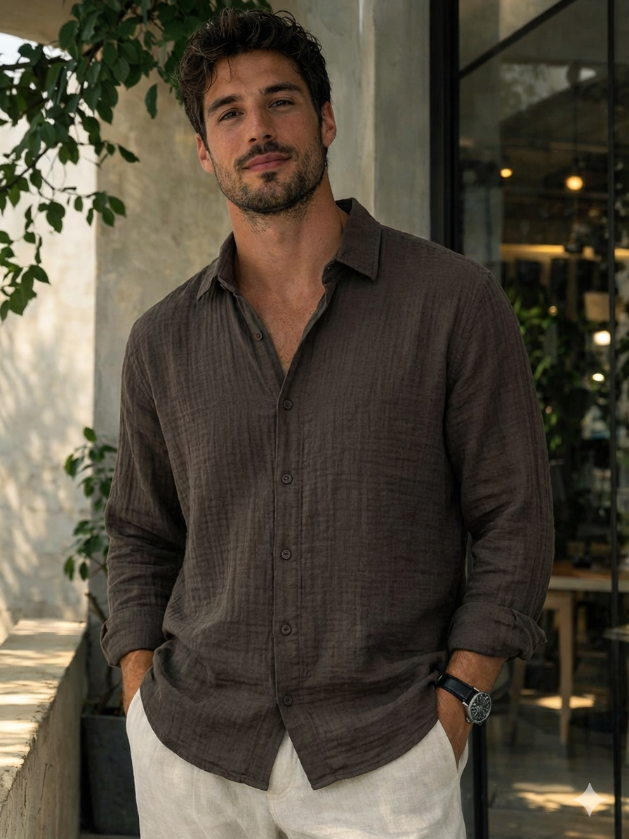 Bu kahve keten gömlek, %100 doğal keten kumaşıyla sıcak yaz günlerinde ideal bir seçim. Dokulu yapısı sayesinde hem şık hem de son derece nefes alan bir parça. Uzun kollu,  casualdan semi-formal kombinlere kadar her tarza uyum sağlar. Dokusu ve rahat kalıbıyla İstanbul’un nemli yaz akşamlarında bile konforlu.