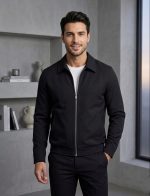 Erkek siyah fermuarlı mevsimlik ceket ile modern stil.