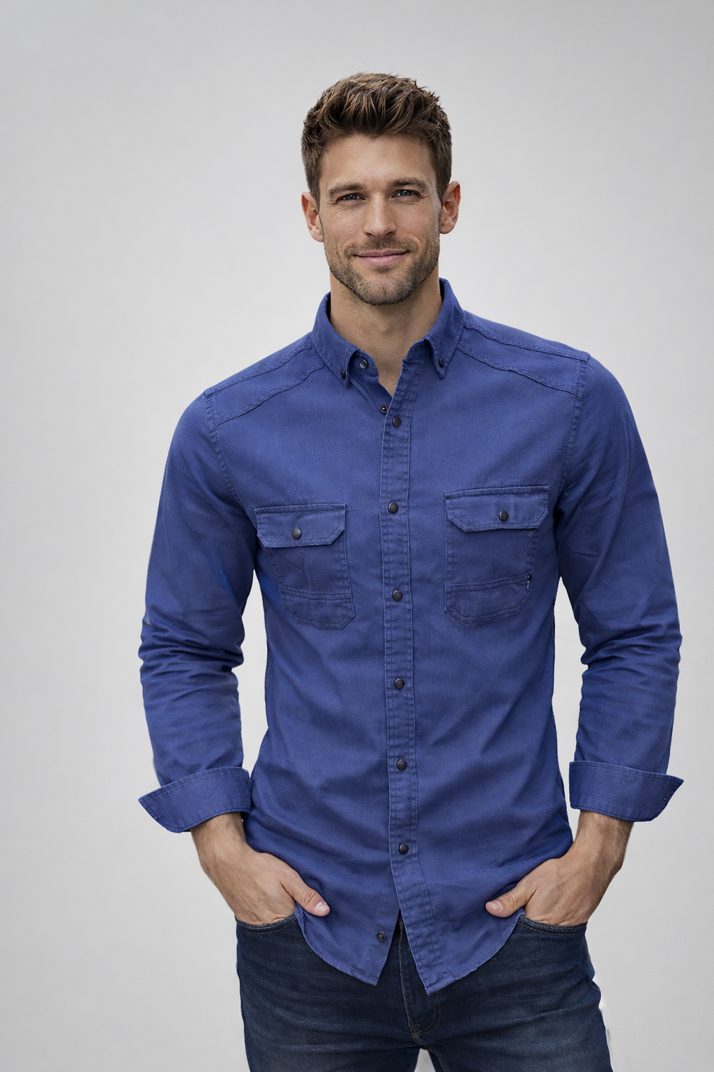 Lacivert Slim Fit Erkek Gömlek – Çift Cepli, Uzun Kollu, Günlük & Casual Şıklık