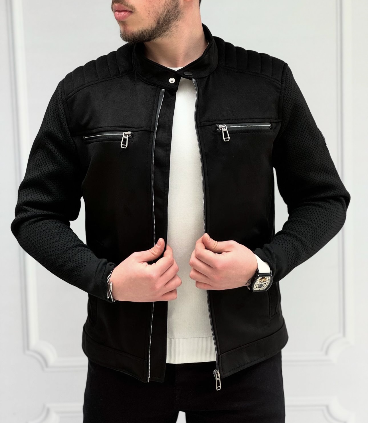 Erkek fermuarlı mevsimlik ceket ile modern stil.
